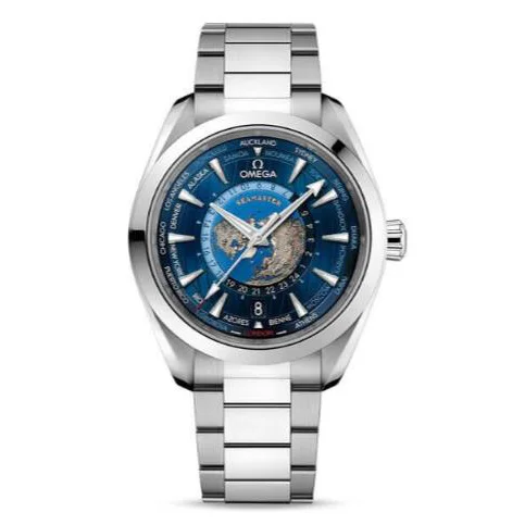 This 43 mm Worldtimer model includes a polished case and bracelet in stainless steel. The exterior section of the dial is sun-brushed blue and includes vertical teak stripes and a circle of global destinations printed in red (GMT), silvery (+1h in summer) and blue (places without daylight savings). The centre of the dial contains a 24-hour glass ring, with light blue to indicate daytime and dark blue to indicate night. The vision of Earth is created on a grade 5 titanium plate. This has been laser-ablated to create the blue ocean, leaving a relief of the continents. The contrasting colours of the Earth’s surface are obtained naturally by the laser’s chemical reaction. Inside, the Worldtimer is driven by the Master Chronometer Calibre 8938.