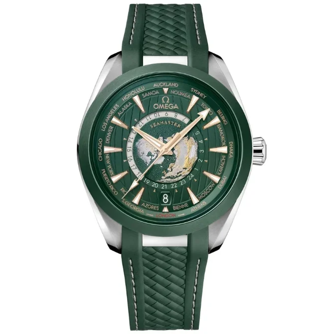 Omega Seamaster Aqua Terra 150m GMT Worldtimer 220.32.43.22.10.001 Green Dial Green Rubber Strap 43mm Super Clone