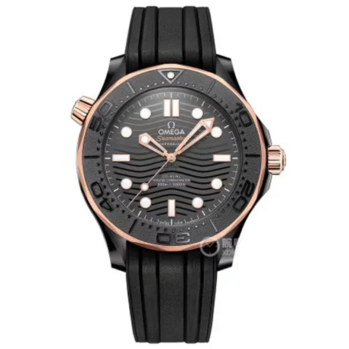 On this 43.50 mm model, black ceramic [ZrO2] dominates. The case, bezel, wave-pattern dial, crown and helium escape valve, all in the same striking material, give the watch a very distinctive, uniform and sculptural look. To ensure visibility without affecting the overall aesthetic, OMEGA has introduced anthracite Super-LumiNova to the diving scale, the black PVD indexes and skeleton hands - and dot at 12H.