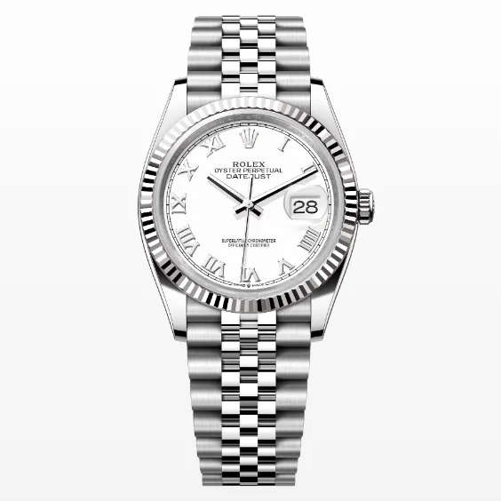 Dial: White dial with roman numerals and date window.