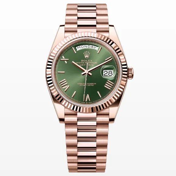 Dial: Olive green dial with roman numeral indices, and day and date window.