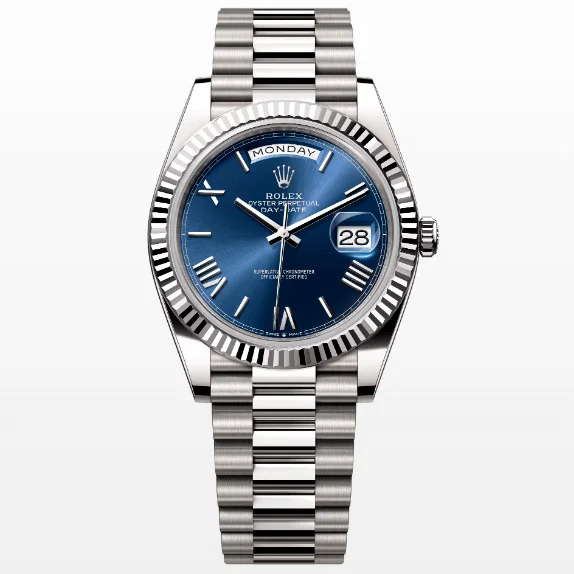 Case: White gold plated case (tungsten weighted) with screw down crown and fluted bezel. Case diameter: 40mm. Height: 12mm. (904L Stainless Steel)