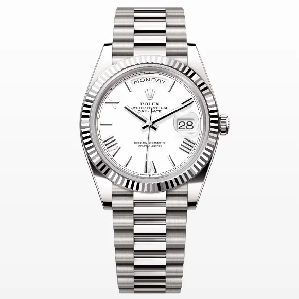 Dial: White dial with roman numeral indices and day and date window.